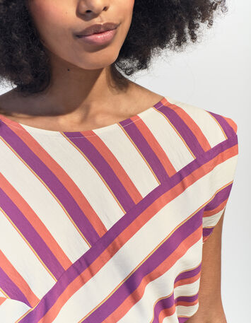 Le pouvoir du top CANDI ? Un porté réversible, proposant le col bateau devant et l'encolure V au dos, ou l'inverse. Et des rayures de couleurs qui réveillent le look d'un twist arty.