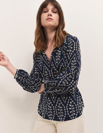 Optez pour une transition de saison toute en douceur. La blouse COLOMBE s'autorise une popeline de bleu marine, réveillée par des broderies écrues en all over. On apprécie le col à porter ouvert ou boutonné.