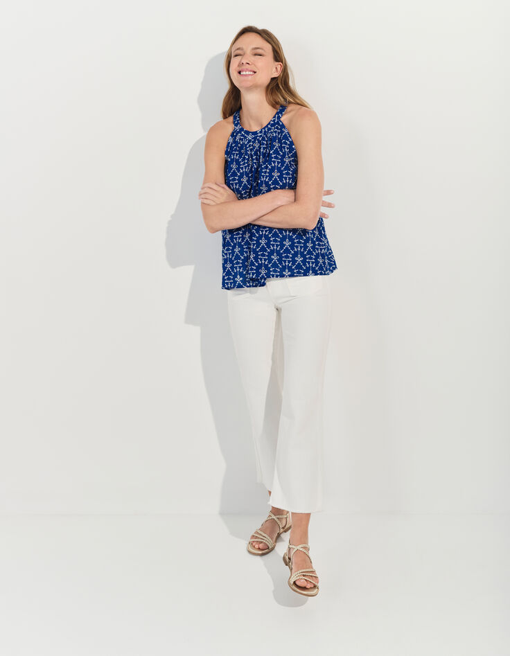 Le top CORTES propose une nouvelle version de l'été… Lumineux, il se décline en coloris saphir blue. Précieux, il est décoré de néo-broderies. En popeline de coton légère et 100% bio, il s'offre une coupe évasée, mise en valeur par des emmanchures américaines qui dévoilent les épaules.