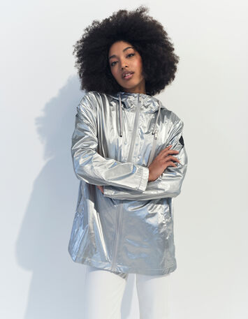 Danser sous la pluie ! C'est l'invitation de la parka DUARTE. Toute en légèreté, elle se décline en coloris argenté, avec doublure façon résille. Une pièce idéale à superposer sur les vestes ou pulls de la saison.