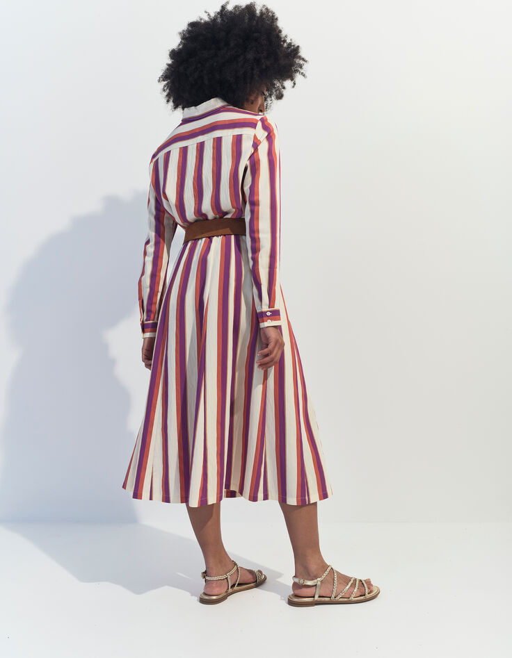 La jupe JOYAU porte bien son nom. Longueur midi, entièrement boutonnée devant, elle s'offre un motif rayures couleur exclusif, dans les tons d'écru, orange et violet. Les plus audacieuses l'associeront à la chemise CHRISTA assortie.