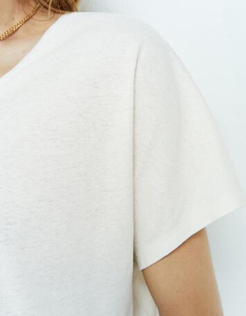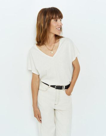 Encolure V, manches courtes, le T-shirt MAGIC est un essentiel du dressing d'été. Il gagne en chic par une finition foil sur fond écru, qui apporte un effet légèrement pailleté.