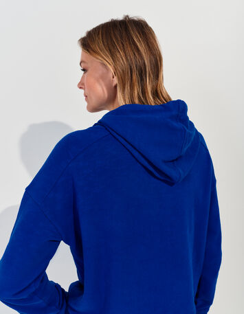 Le sweat à capuche MANORI est un véritable hymne à la douceur. En molleton de coton 100% bio saphir blue, il se pare de notre danseuse emblématique en flocage gomme à motif pois, sur le devant.