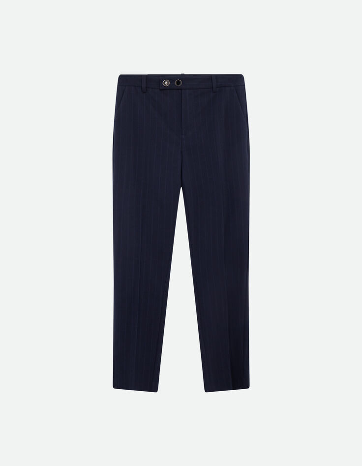 LA signature d'un look urbain, c'est PETUNIA : un pantalon cigarette, décliné en coloris marine, avec motif rayures tennis bleues, sur une toile effet laine froide, assurant un tombé impeccable. Son alliée ? La veste de costume VIOLETA.