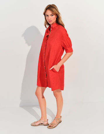 Prenez une chemise. Offrez-lui quelques centimètres supplémentaires. Découvrez REACH, LA robe chemise parfaite. En toile de lin surteint légère, elle se décline en coloris orange vif très lumineux. Un must-have à porter fermée avec des sandales, ou même ouverte, sur un débardeur et un short.