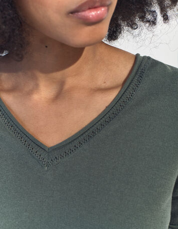 - Coupe droite, encolure V, manches longues, emmanchures descendues