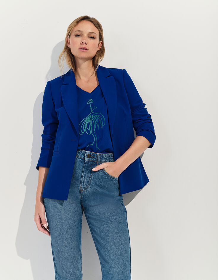 Réveiller le dressing d'été. C'est la promesse de la veste de blazer VOLTA. En crêpe envers satin, elle s'autorise un coloris saphir blue, très lumineux et se ferme par un bouton recouvert.